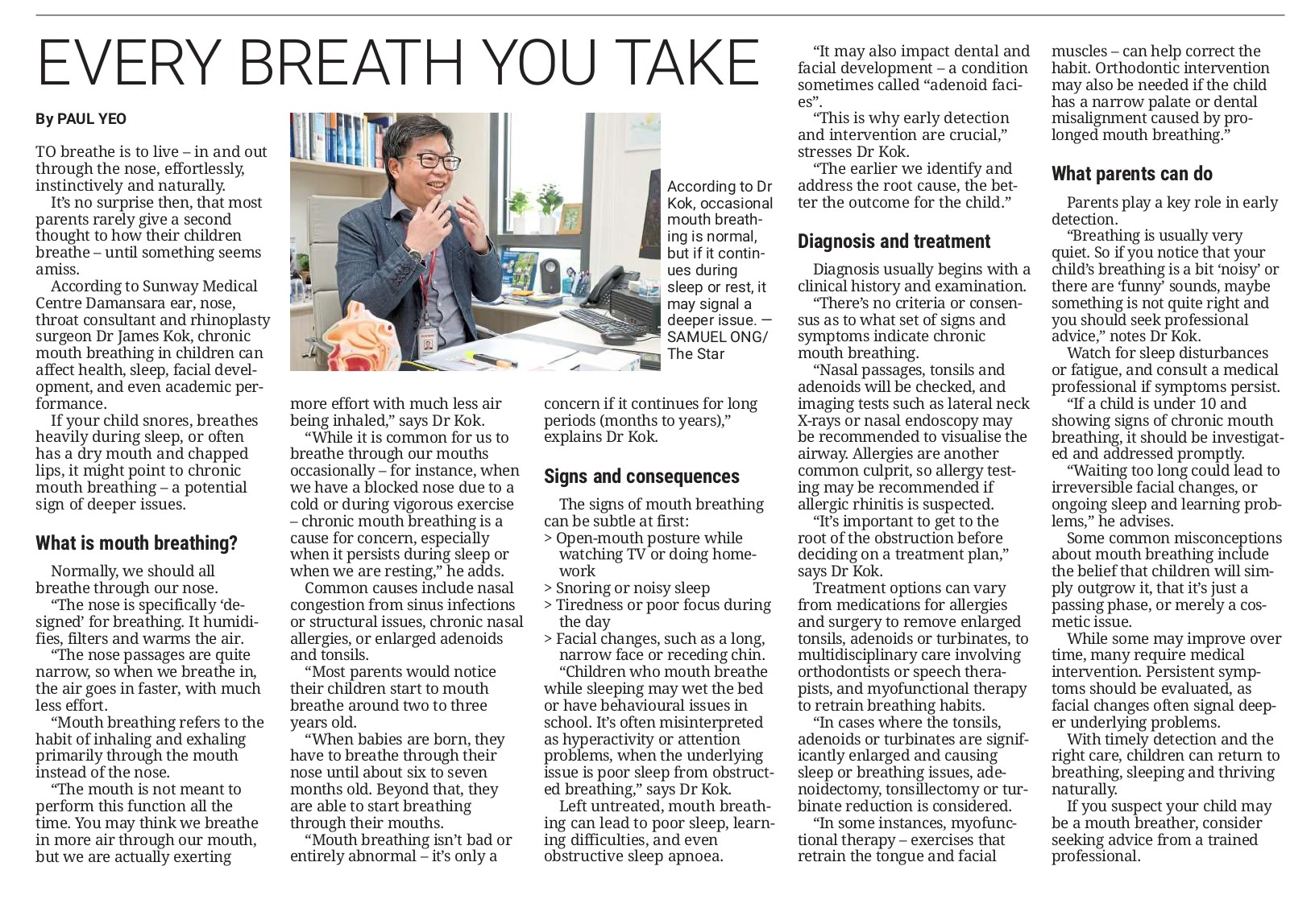 Parents play a key role in early detection. “Breathing is usually very quiet. So if you notice that your child’s breathing is a bit ‘noisy’, or there are ‘funny’ sounds, maybe something is not quite right and you should seek professional advice,” notes Dr Kok.
